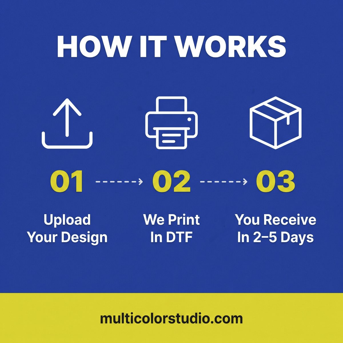 Upload your design and we’ll handle the rest. Whether you’re making a single personalized shirt, launching a t-shirt line, or producing merchandise for your brand, our DTF transfers deliver crisp details, rich colors, and excellent wash durability.