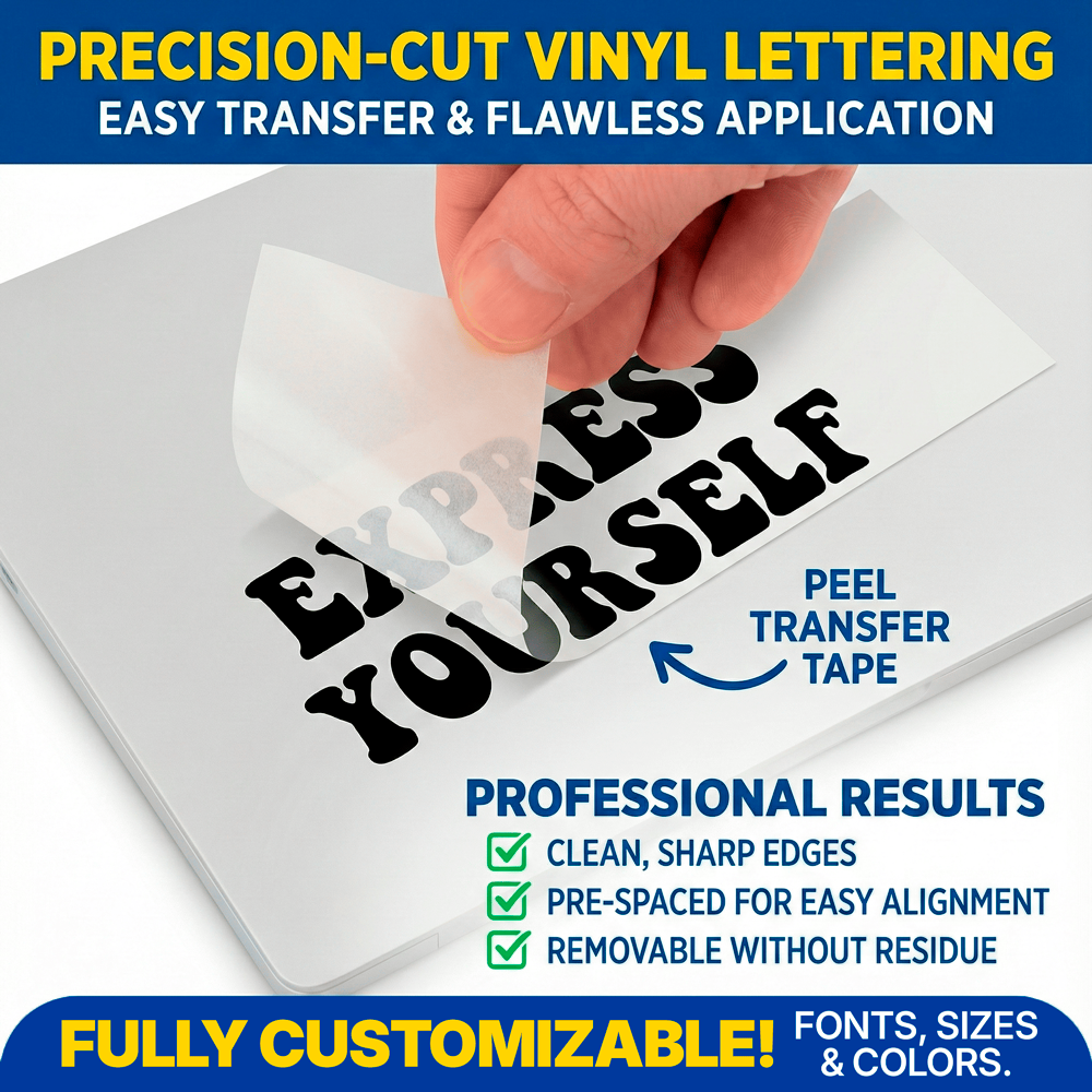 Vinyl Lettering (also known as Transfer Decals or Die-Cut Vinyl) is not a standard printed sticker. It is solid-colored vinyl cut with surgical precision. When applied, there is no clear or white background—only your letters or design remain, looking as if they were painted directly onto the surface.
